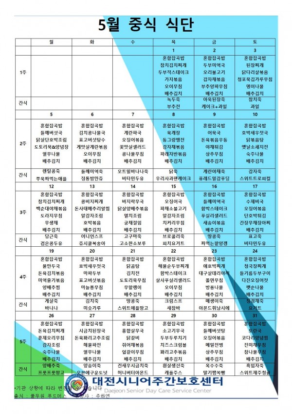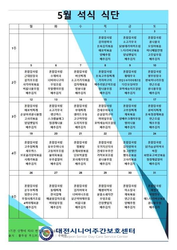 5월 식단표 페이지 정보 작성자 최고관리자 작성일25-04-30 13:23 조회662회 댓글0건 관련링크 이전글 다음글 목록 본문 2025년 5월 식단표입니다. 댓글목록 등록된 댓글이 없습니다. 이전글 다음글 목록