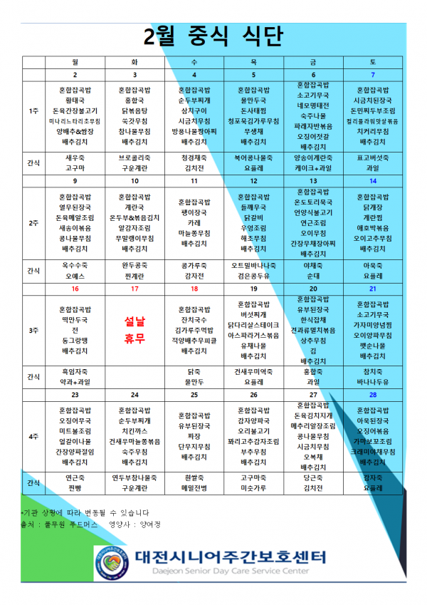 2월 식단표 페이지 정보 작성자 최고관리자 작성일26-01-31 15:35 조회151회 댓글0건 관련링크 이전글 다음글 목록 본문 2026년 2월 식단표입니다 :) 댓글목록 등록된 댓글이 없습니다. 이전글 다음글 목록
