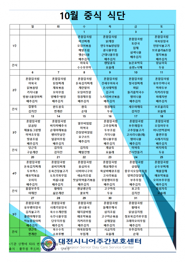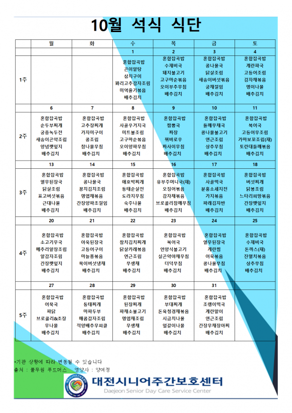 10월 식단표 페이지 정보 작성자 최고관리자 작성일25-09-30 09:43 조회272회 댓글0건 관련링크 이전글 다음글 목록 본문 2025년 10월 식단표입니다:) 댓글목록 등록된 댓글이 없습니다. 이전글 다음글 목록