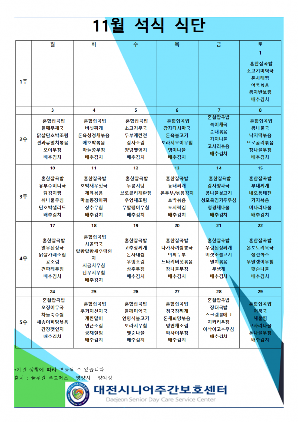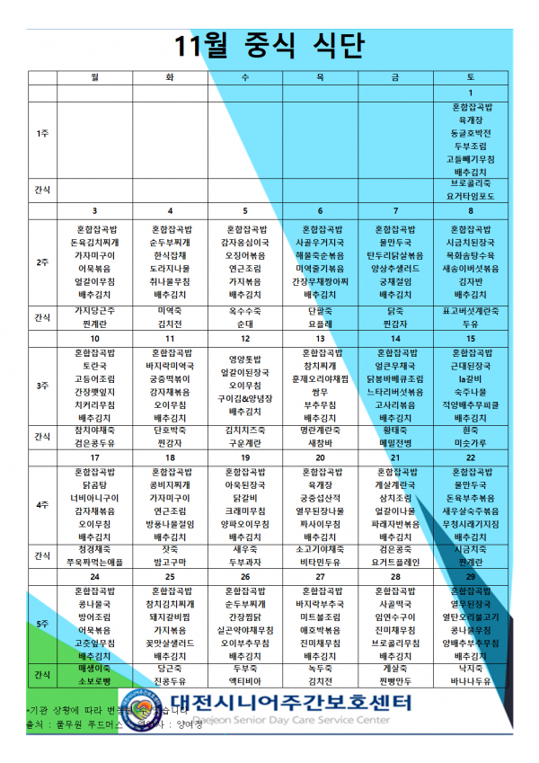 11월 식단표 페이지 정보 작성자 최고관리자 작성일25-10-31 15:18 조회168회 댓글0건 관련링크 이전글 다음글 목록 본문 2025년 11월 식단표입니다. :) 댓글목록 등록된 댓글이 없습니다. 이전글 다음글 목록