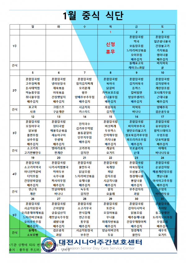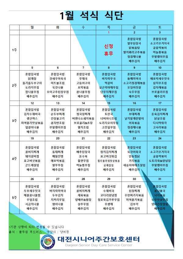 1월 식단표 페이지 정보 작성자 최고관리자 작성일25-12-31 16:15 조회230회 댓글0건 관련링크 이전글 다음글 목록 본문 2026년 1월 식단표입니다. :) 댓글목록 등록된 댓글이 없습니다. 이전글 다음글 목록