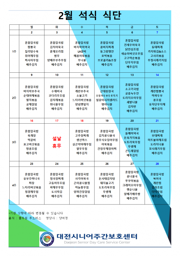 2월 식단표 페이지 정보 작성자 최고관리자 작성일26-01-31 15:35 조회158회 댓글0건 관련링크 이전글 다음글 목록 본문 2026년 2월 식단표입니다 :) 댓글목록 등록된 댓글이 없습니다. 이전글 다음글 목록